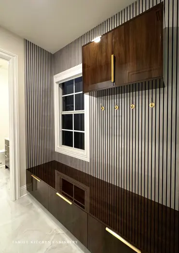 This custom mudroom features high-gloss wood cabinetry with brass hardware, combining elegance and functionality.